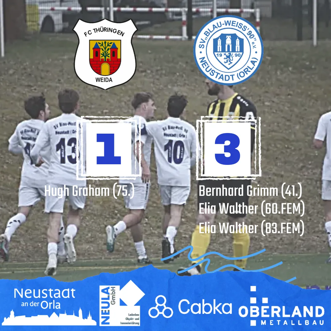 SV Blau-Weiß 90 Neustadt/Orla: Maximilian Paul, Maxim Engler (92. Martin Köhler), Alex Michallik, Elia-Abraham Walther (85. Paul Weise), Bernhard Grimm, Peter Wittwer, Theodor Mohorn, Luca Schumann, Robin-Lee Engler, Josia-Levi Walther (72. Fabien Seidel), Jonas Wahl (91. Ben Brossmann) - Trainer: Jürgen Walther - Co-Trainer: Kai-Uwe Scheuerl