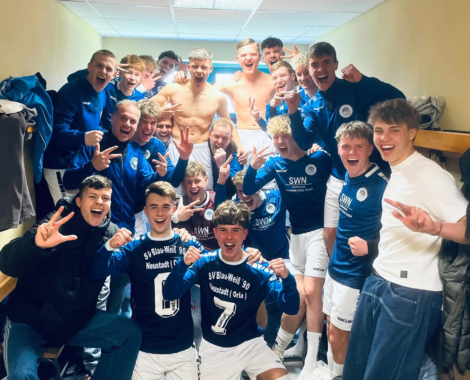 Verbandsliga | Blau-Weiß Neustadt – 1. FC Greiz 1:0 (0:0) Blau-Weiß Neustadt bleibt auf Kurs: Nach den Siegen gegen Wismut Gera und Thüringen Jena war die Marschroute klar – auch im Heimspiel gegen den 1. FC Greiz sollten drei Punkte her. Am Ende wurde es ein dramatischer Last-Minute-Erfolg, der zwar glücklich, aber keineswegs unverdient war. Die Partie begann mit einem frühen Ausrufezeichen der Hausherren: Bereits in der 4. Minute setzte Connor Breternitz zu einer starken Vorarbeit an, doch Louis Krawczyk verpasste die Führung knapp. In der Folge entwickelte sich ein ausgeglichenes Spiel, in dem sich beide Teams weitgehend neutralisierten und offensive Höhepunkte Mangelware blieben. Erst in der 38. Minute wurde es wieder gefährlich – und zwar auf der anderen Seite. Nach einer Neustädter Standardsituation schaltete Greiz schnell um, doch der Abschluss im Konter rauschte knapp am Tor vorbei. Kurz vor der Pause dann die dicke Doppelchance für Blau-Weiß: Zunächst klatschte ein Weitschuss an den Querbalken, im Nachsetzen verpasste Mohorn sein erstes Tor für Neustadt und setzte den Ball an den Pfosten (41.). So ging es torlos in die Kabinen. Zur Pause musste Neustadt erstmals wechseln: Hugo Schoberth ersetzte den verletzten Matti Matterne. Die Gastgeber wollten nun früh für klare Verhältnisse sorgen, doch das Vorhaben verpuffte – das Spiel blieb zerfahren und spielte sich überwiegend im Mittelfeld ab. Frischer Wind kam durch die Wechsel: Tobias Risch (60.) und A-Junioren-Debütant Bertil Rasim (67.) brachten neue Impulse. Gerade Rasim belebte das Offensivspiel spürbar und hatte direkt zwei große Chancen, ließ diese aber ungenutzt. Gleichzeitig blieb Greiz stets gefährlich, sodass Lennox Schmidt und Romeo Brünner in der Defensive alle Hände voll zu tun hatten. Als alles auf ein torloses Remis hindeutete, überschlugen sich die Ereignisse in der Schlussphase. Zunächst scheiterte Risch erneut am Querbalken. Im Gegenzug setzte Greiz einen Freistoß im Gewühl an den Pfosten. Und dann die Nachspielzeit: Neustadt warf noch einmal alles nach vorn. Nach einem langen Ball wurde Lennox Schmidt im Strafraum zu Fall gebracht – Elfmeter (90.+4). Romeo Brünner behielt die Nerven und verwandelte sicher zum umjubelten 1:0. Ein Sieg der Kategorie „Last Minute“, der durch die Dramatik vielleicht glücklich wirkt, insgesamt aber verdient ist. Die Neustädter A-Junioren bestätigen damit ihre starke Form und holen 10 Punkte aus den letzten fünf Spielen.